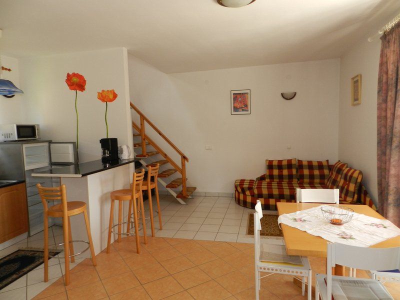 Unser Dreizimmerappartement 2 mit ca. 75 qm Wohnfläche, Aufenthaltsraum mit integrierter Einbauküche und Schlafsofa, sowie Dusche/WC im EG, 2 Schlafzimmer mit je 2 Betten sowie Dusche/WC im OG. Dazu gehört eine große Terrasse. Notfalls stehen 2 Notbetten zur Verfügung.