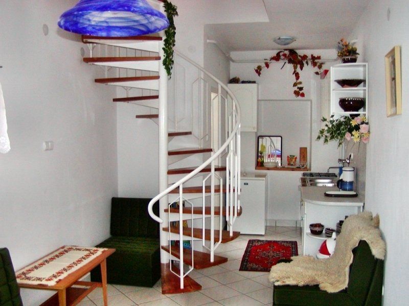 Unser Dreizimmer-Appartement 1 mit ca. 75 qm Wohnfläche, Aufenthaltsraum mit integrierter Einbauküche und Schlafsofa, sowie Dusche/WC im EG, 2 Schlafzimmer mit je 2 Betten sowie Dusche/WC im OG. Dazu gehört eine große Terrasse. Notfalls stehen 2 Notbetten zur Verfügung.
